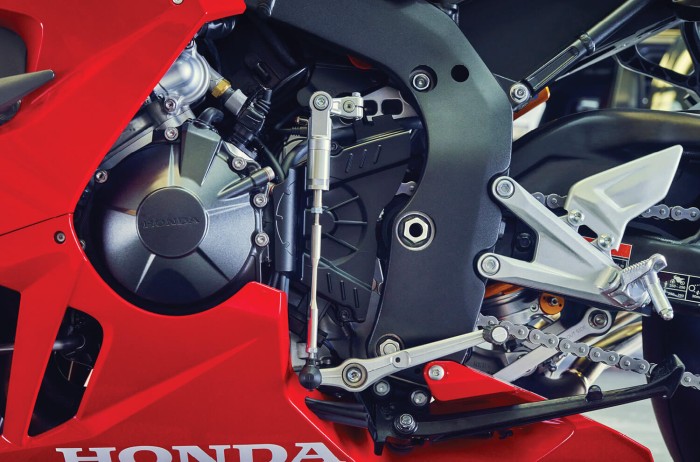 Easier to move around, react, and control quickly on road or racetrack; handlebars are higher, footpegs lower. Development and optimisation of the twin-spar aluminium frame have removed nearly 1kg. A new rigidity balance delivers reduced lateral stiffness & less torsional stiffness, for sharp steering & higher mid-corner speed. Updated settings for the Showa Fork & Pro-Link shock increase feedback & feel, to the absolute limit.
