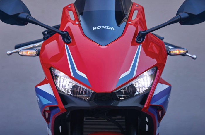 CBR. Three very special letters with a momentous history. Drawing heavily on the Fireblade for its design – with new paint and graphics straight out of pit lane – the CBR500R wears the same aerodynamic winglets for stability on corner entry and razor-sharp high-speed agility. From the aggressively redesigned headlights, which throw out a broad, penetrating beam for safer cornering at night, and sculpted-for-speed fairing right back to the tightly wrapped seat unit, this is a sporting benchmark.