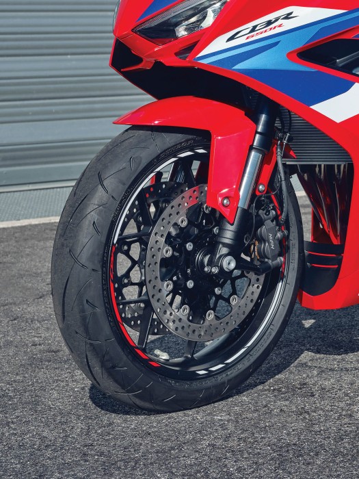 Our Anti-Lock Braking System can be a big help in making controlled stops in less-than-ideal conditions, like on wet pavement or other compromised surfaces. It’s a great choice whether you're using your new bike as a commuter or just riding it for fun, since it helps you stop with added confidence. Featuring huge 310mm discs on the front, the CBR650R also comes with radial-mounted four-piston callipers. The result is premium sportbike stopping power that’s linear and easy to modulate. A 240mm hydraulic disc at the rear complements the twin front discs for plenty of stopping power.