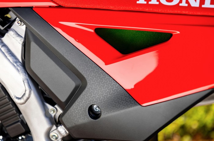 The new shape provides a straighter pathway for airflow to deliver more torque and better throttle control. The CRF450R’s air filter features a spring-loaded clip design and optimised rubber gasket for easy cleaning and improved serviceability.