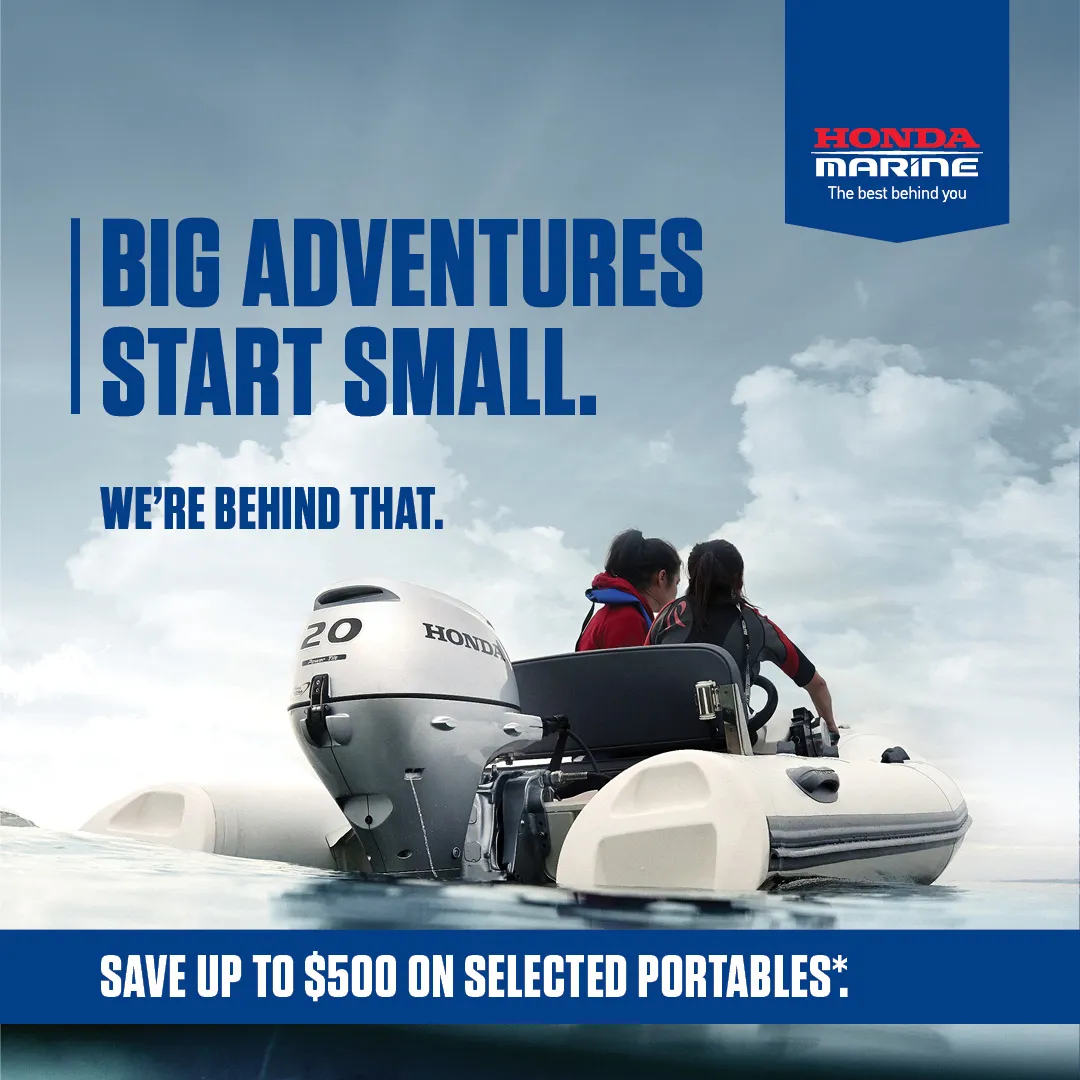Big adventures start small with a Honda portable outboard. For a limited time, save up to $500 on selected 2.3hp–20hp Honda 4-stroke outboards and get ready to explore more this season.