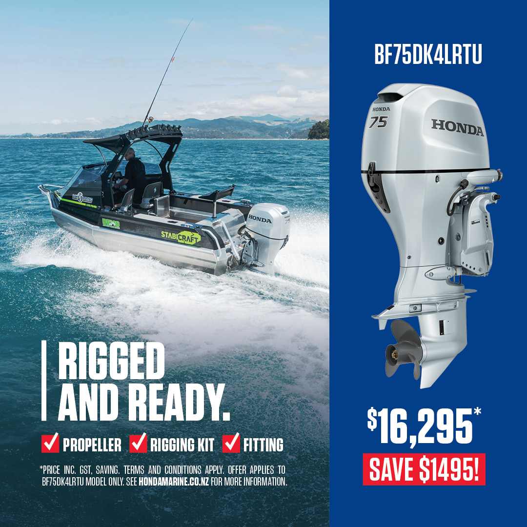 • Rigged and Ready pricing offer for Mechanical BF50 & BF75 Honda Outboard engine is inclusive of standard side remote, Tachometer and Trim gauge, wiring harness, alloy 3-blade propeller, 25L fuel tank and boat fitting.