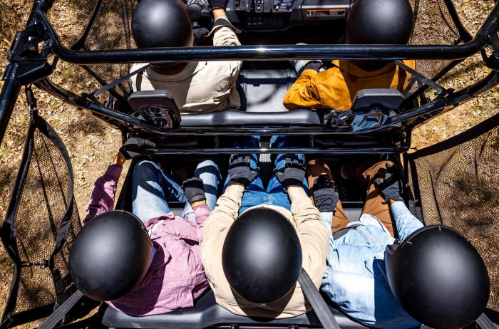 This side-by-side has a full-sized crew-cab-style back seat with massive leg and foot room for rear passengers, including the center seat positioned forward to avoid bumping shoulders with other passengers. The front row offers a tilting steering wheel making it super easy to get in and out, even while wearing heavy work gear.
